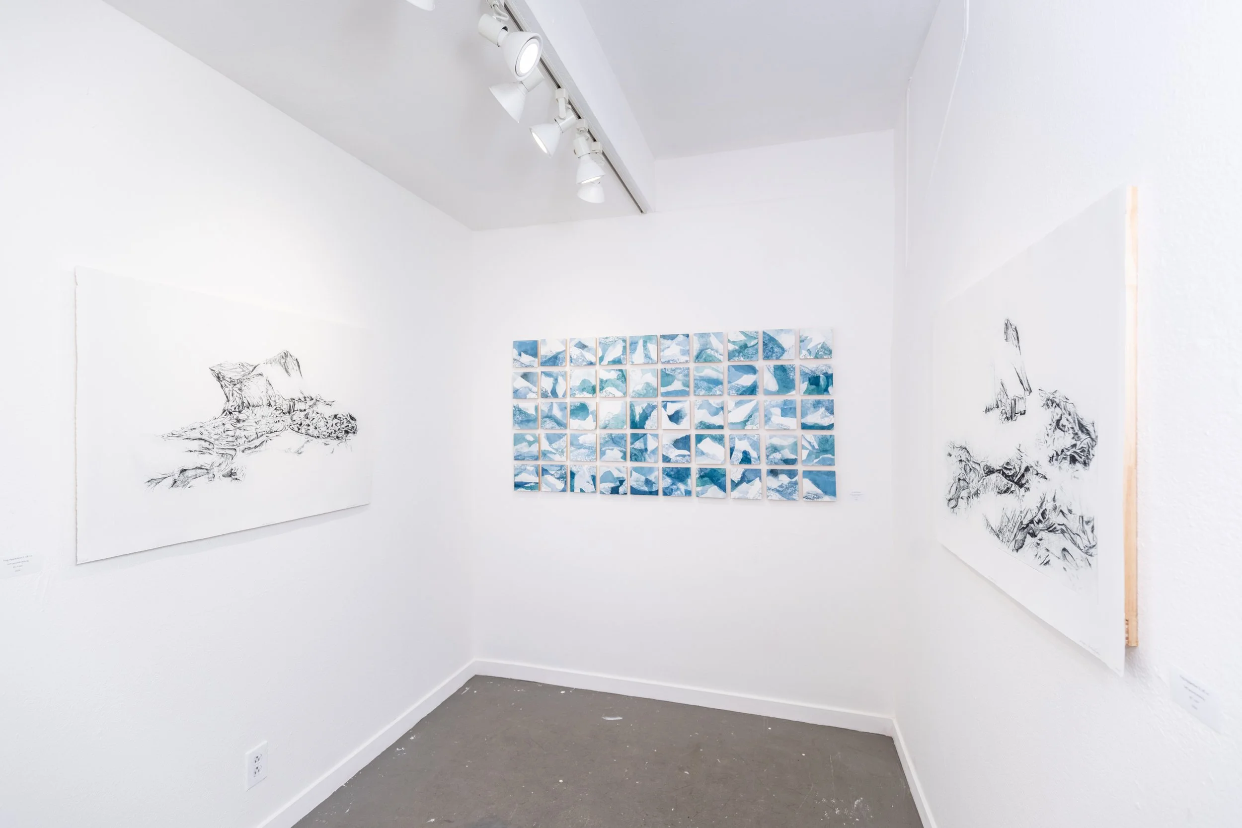 I’m a visual artist using experimental etching and drawing techniques to process at-risk local and global environments. A fascination with natural elements and transformation fuels my work and I am particularly interested in air currents, fog, and bodies of ice and water. I am heavily influenced by the famous pale blue dot photograph, onsite studies in the Arctic, and geologic deep time. My imagery is often fragmented as if swept away on the wind or lost to time. Atmospheric shapes chase and erase solid forms as imagery disappears and reforms. This sense of losing one’s way within the work echoes the damaging ways in which geopolitics and capitalism have affected planetary health.